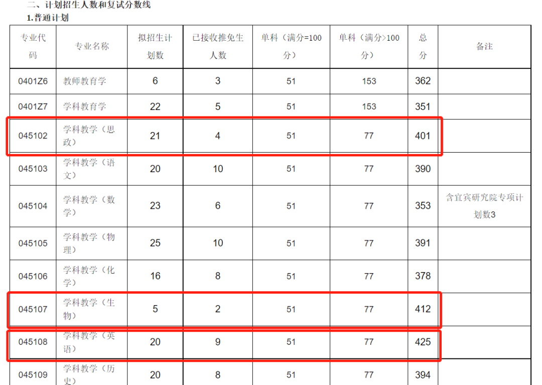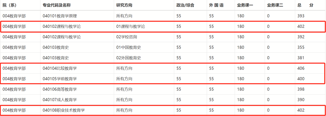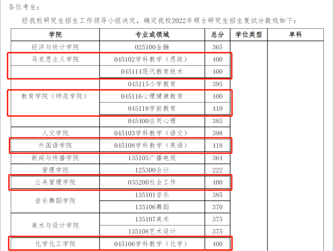 学科教学(思政)、现代教育技术、心理健康教育、学前教育、学科教学(英语)、社会工作、学科教学(化学)等众多专业的复试线达到了400分,且学科教学(英语)的分数线也达到了418分。